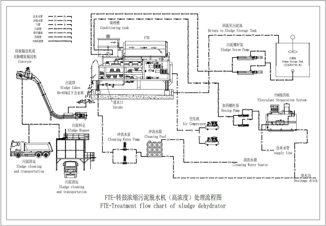 1. De machine was samengesteld uit roterende trommel- en riempress ontwatering. De verwerkingsstroom is slibinlaat, polymeerdosering, mengen, reactie, verdikking en ontwatering onder gestage stroomomstandigheden om het water uit het slib te verwijderen.