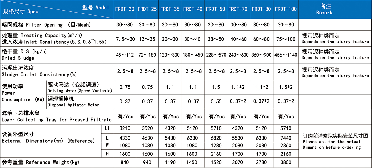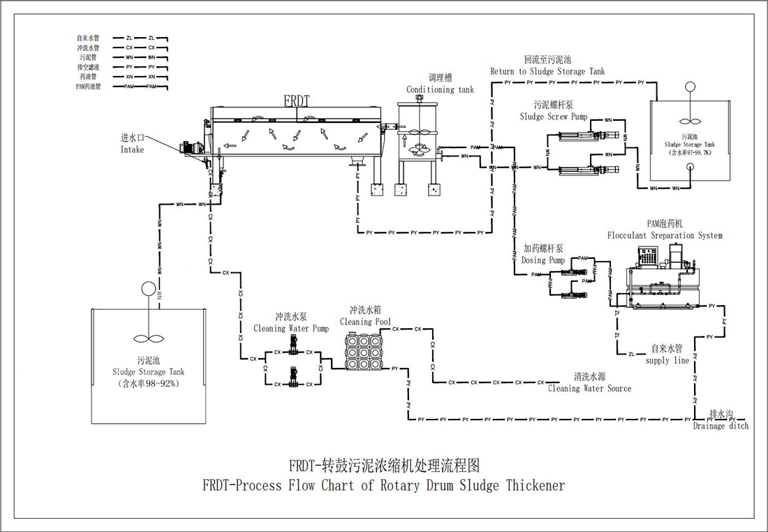 Het werkprincipe van de Rotary Drum Sludge Dikker is heel eenvoudig; Voer het slib in de dynamische reactor door de slibpomp en de doseringspomp, dan gaat het naar de roterende trommel in de verdikkingsmiddel, de roterende trommel met samengestelde filterdoek zal roteren met snelheid rond 10 RMP. Nadat water het filterdoek doordringt, wordt het flocculantslib tegengehouden. Om het filterdoek schoon te houden, zal het reinigingsmondstuk constant het filterdoek reinigen, terwijl het een zachte impact heeft op de floccules. De slibconcentratie na verdikking hangt af van het vaste gehalte aan voedingsslib, de doseringshoeveelheid flocculatie, de roterende snelheid en de diphoek van de trommel.